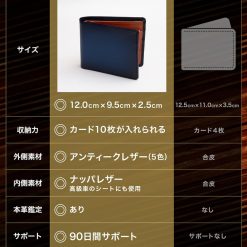 • 【サイズ】幅12.0cm×高さ9.5cm×厚さ2.5cm / 【重量】約80g (化粧箱を除く) / 【付属品】化粧箱/ 【素材】外側:アンティークレザー、内側:ナッパレザー [本革鑑定取得済み]