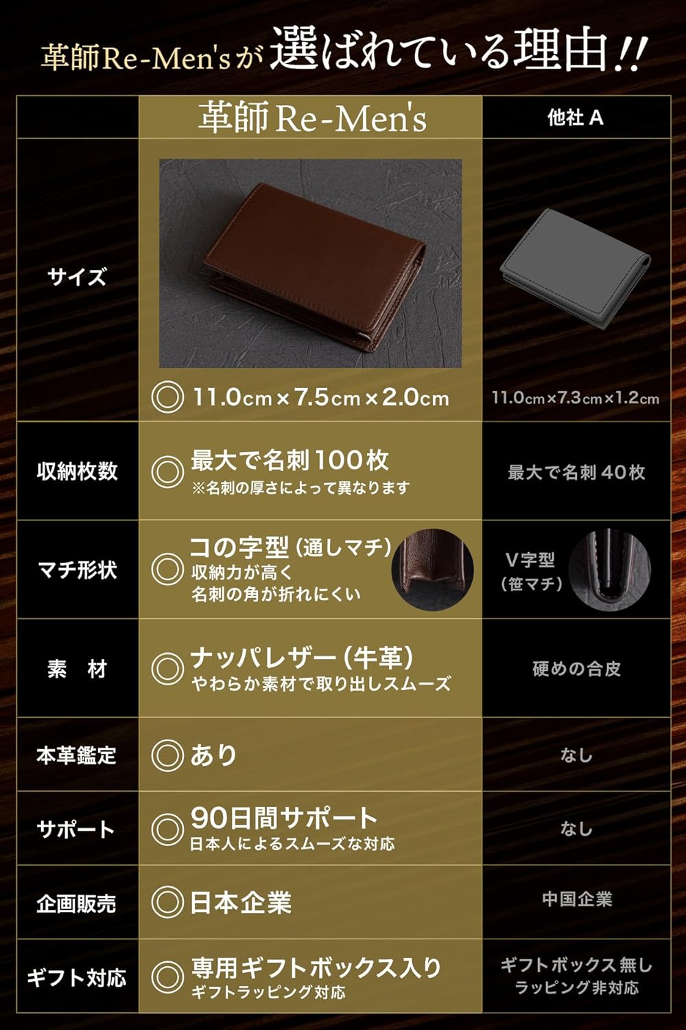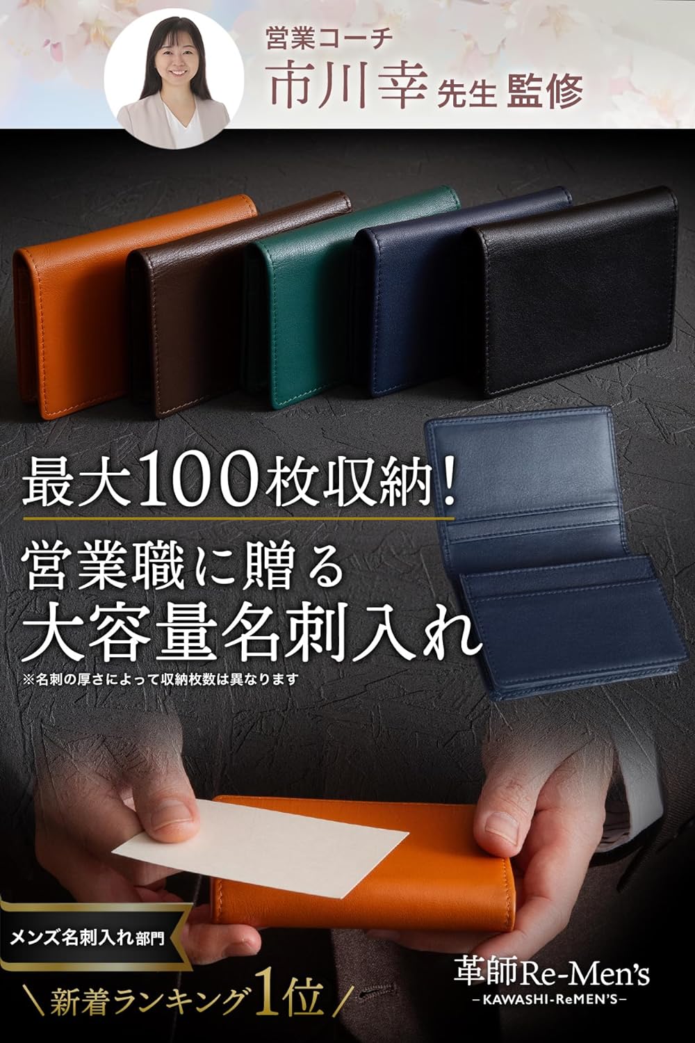 - 【ブランド】 革師RE-MEN’S(革師リ・メンズ)/【商品名】 『営業職に贈る大容量名刺入れ』/【収納力】名刺:最大100枚(注:名刺の厚さが0.23mmの場合)、カードポケット:3区画