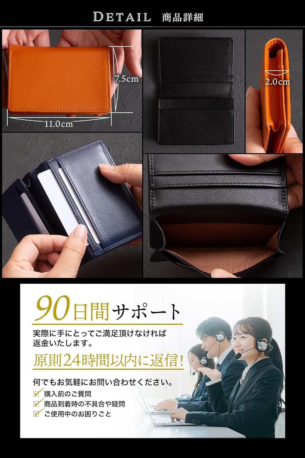 - 【サイズ】幅11.0cm×高さ7.5cm×厚さ2.0cm(※何も入れない時) / 【重量】約40g (化粧箱を除く) / 【カラー】 5通り(ブラック、ダークブラウン、キャメル、ネイビー、グリーン)