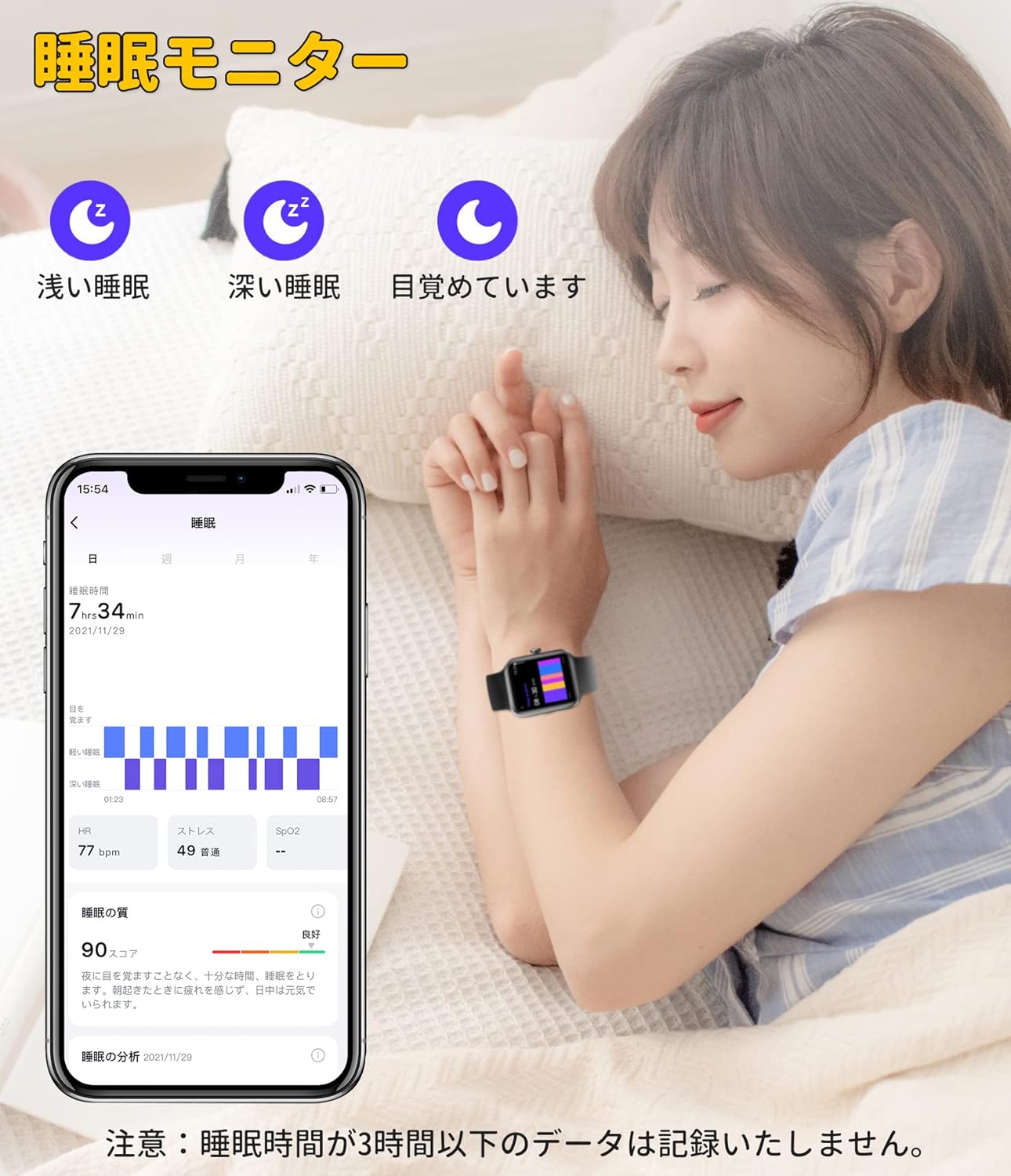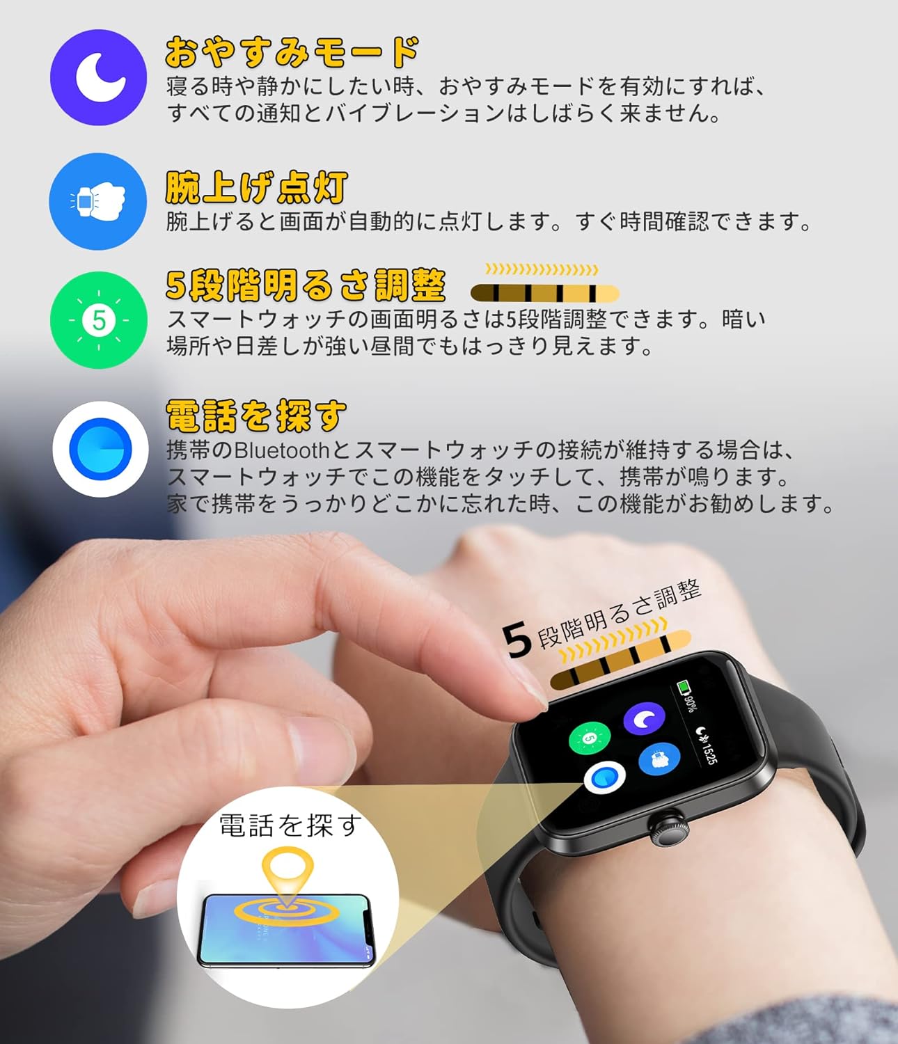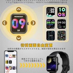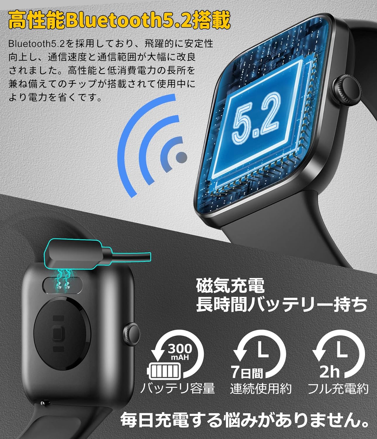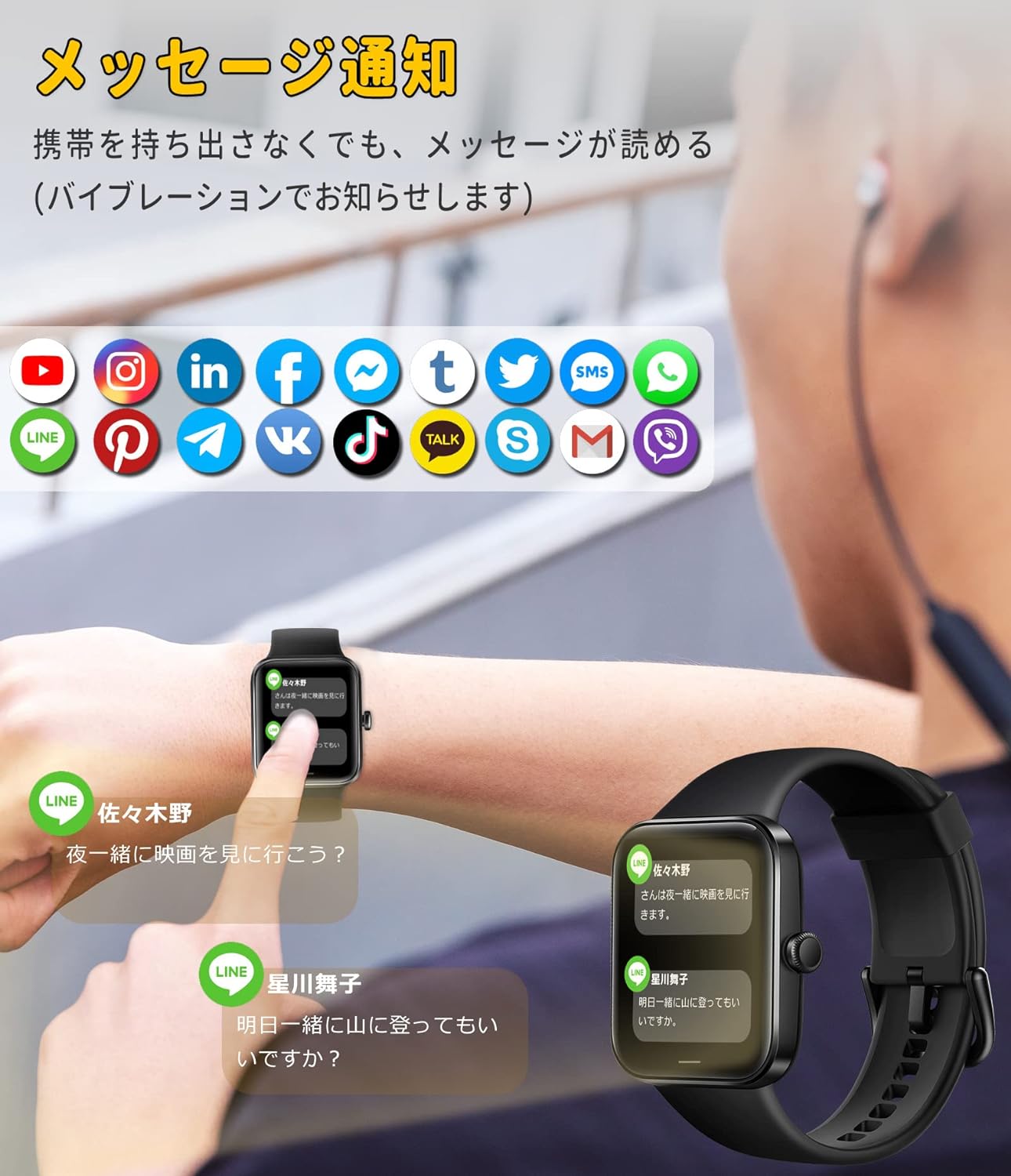 - 💌【便利な通知&多機能搭載】スマートウォッチ はBluetooth 5.2を採用しており、接続が非常に安定なさっております。従来の5.0より、通信速度が2倍、通信範囲が4倍に大幅に改良されました。着信、Line、SMS、Twitter、Facebook、Instagramなどのメッセージ通知はバイブレーションでお知らせされます。ランニング中、会議や運転中など不便な場合には、スマホを出さなくてすべての内容を手首で確認できます。運動中や打ち合わせ中など電話に出られない時は、画面を押して簡単に拒否なさることができます。また、歩数計、睡眠管理、音楽コントロール、目覚まし時計、水飲む通知、座りすぎ通知、運動モード、携帯を探す、腕上げ点灯、タイマー、ストップウォッチ、データ同期、女性生理管理など日常生活に実用的便利な機能を持っております。