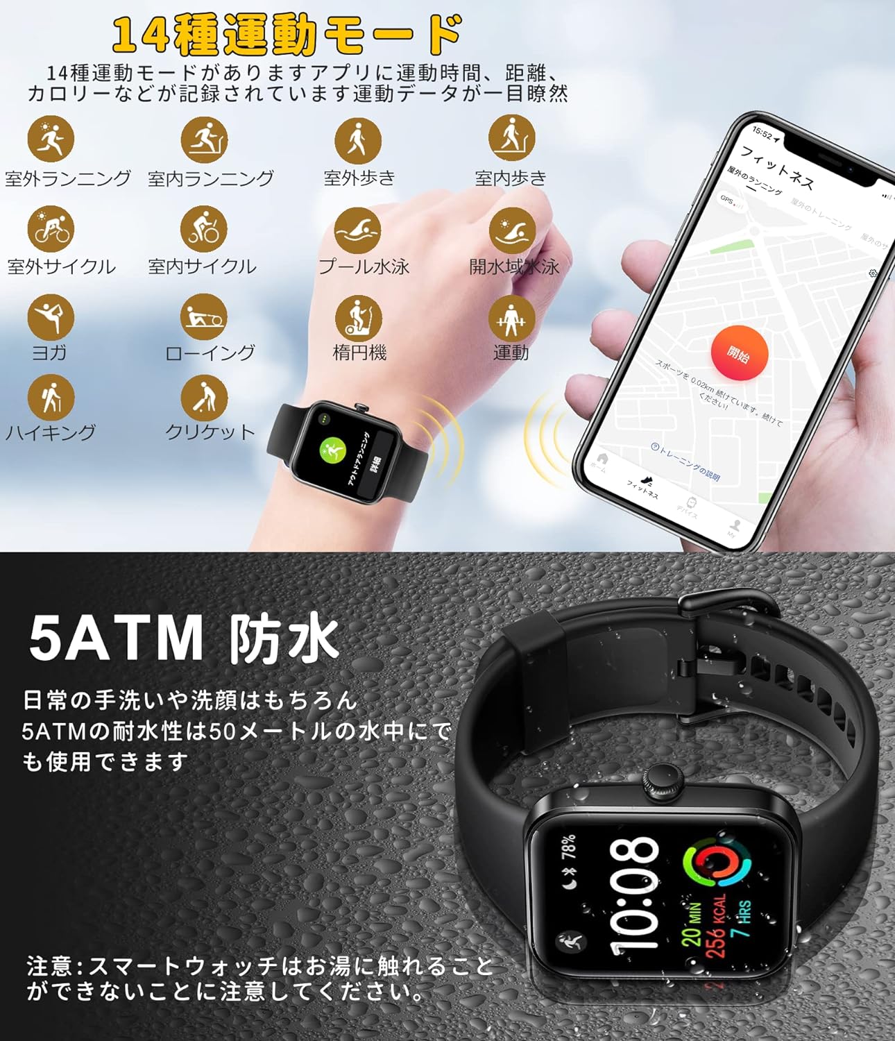- 💦【14種類の運動モード&5ATM防水】フィットネストラッカーはランニング、サイクリング、水泳、ヨガ、ウォーキングなどの14種類のスポーツをサポートなさっております。運動中の歩数や消費カロリー、距離など24時間のデータを正確に記録致します。 リアルタイムで記録されたデータはスマホの「VeryFit」アプリで確認でき、 毎日の運動目標を達成なさる、良い運動習慣をつけるに役立つ。 5ATMの防水レベルは50メートルの水中にでもご使用できます。 スマートウォッチはお湯に触れることができかねますことをご注意なさってください。