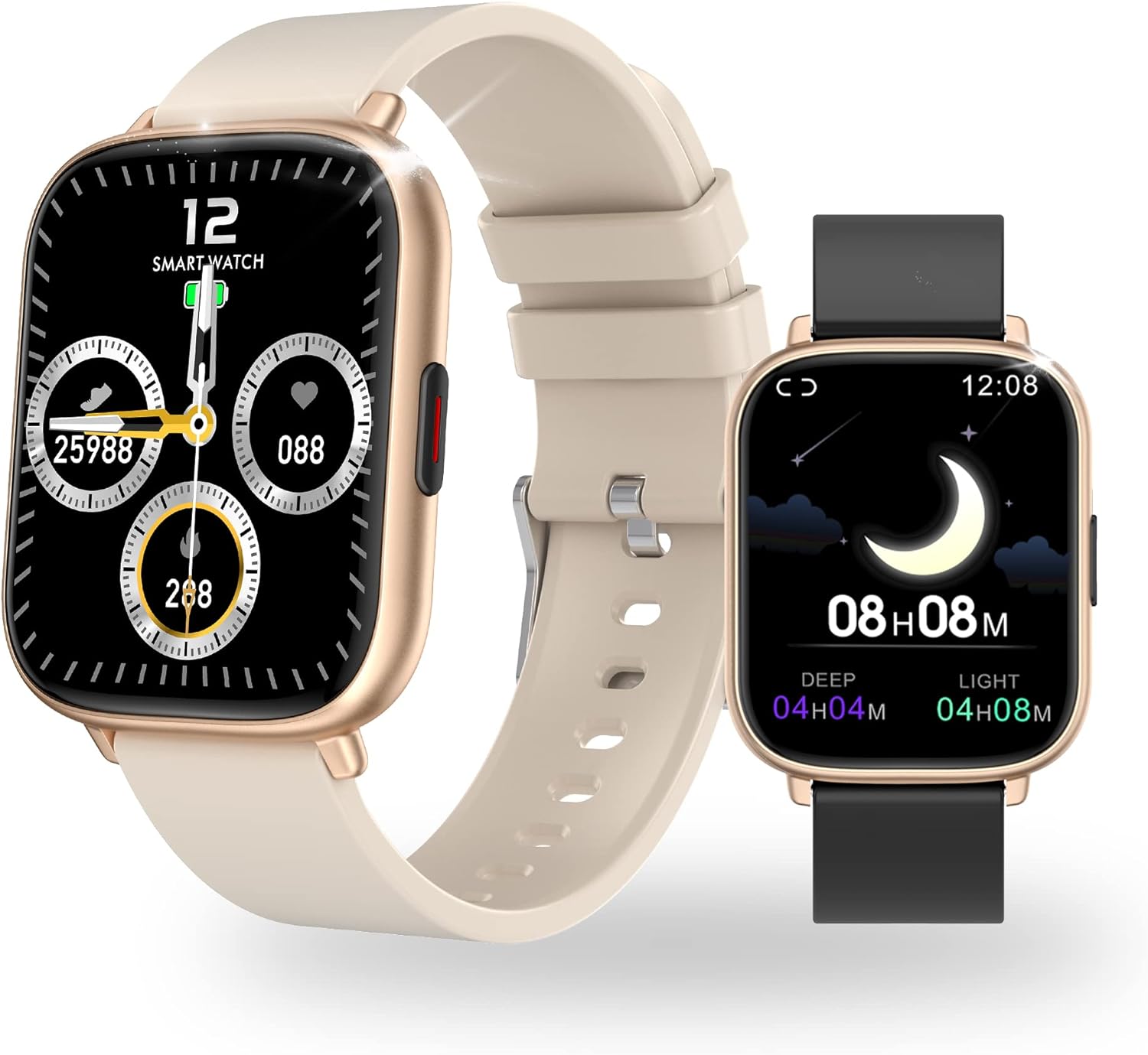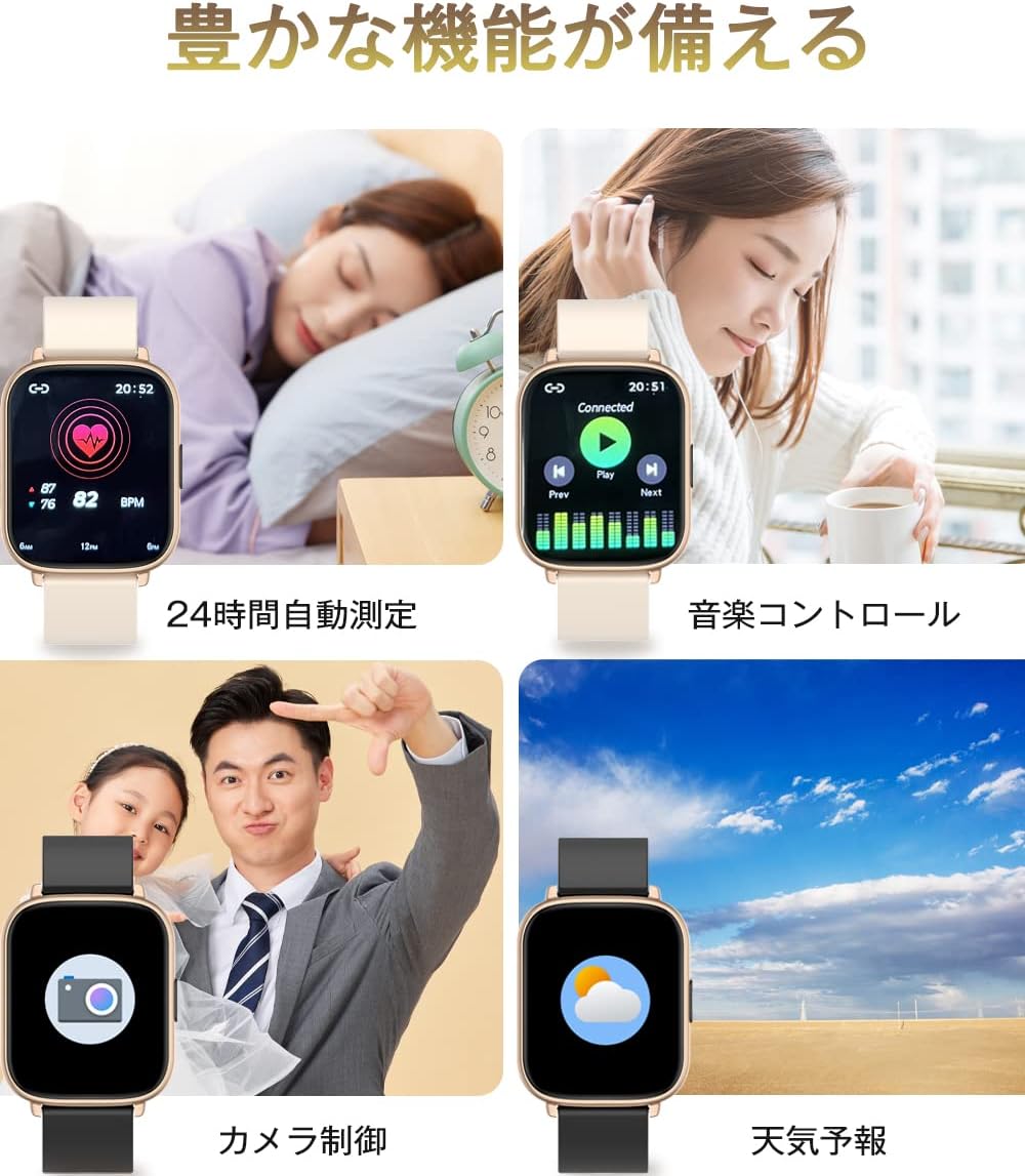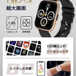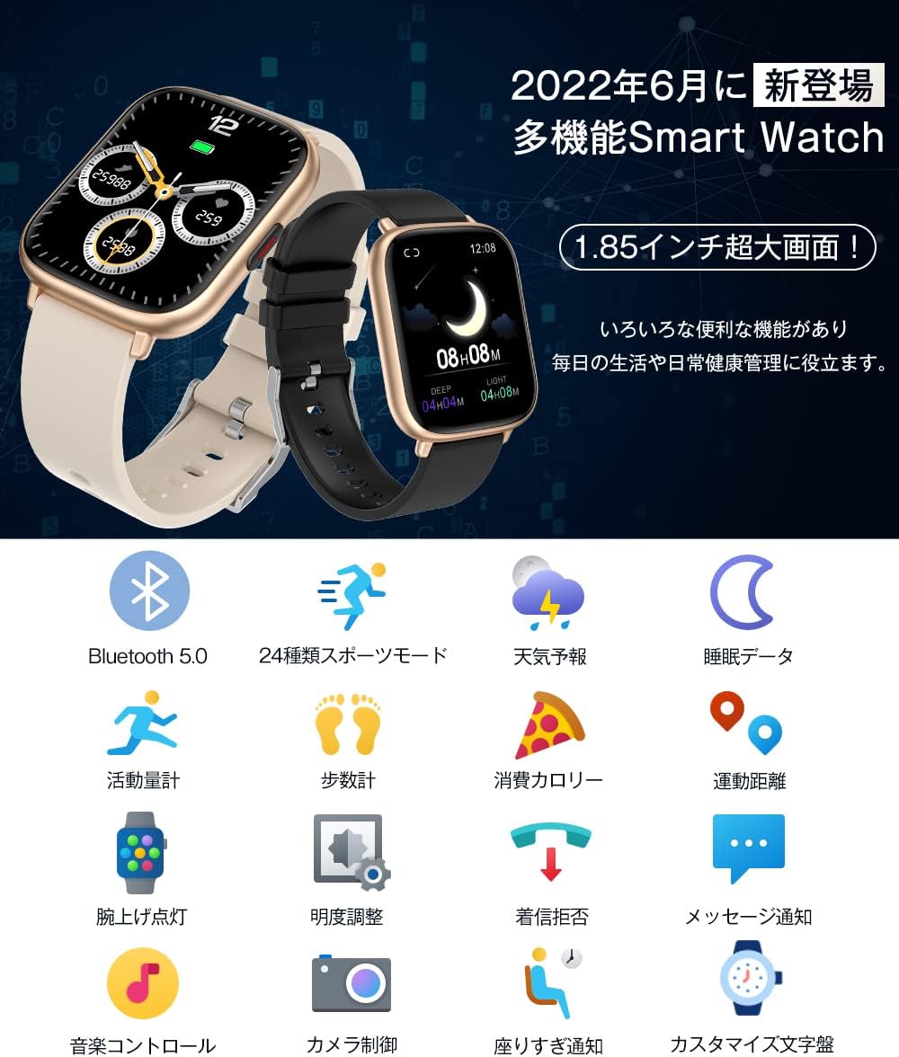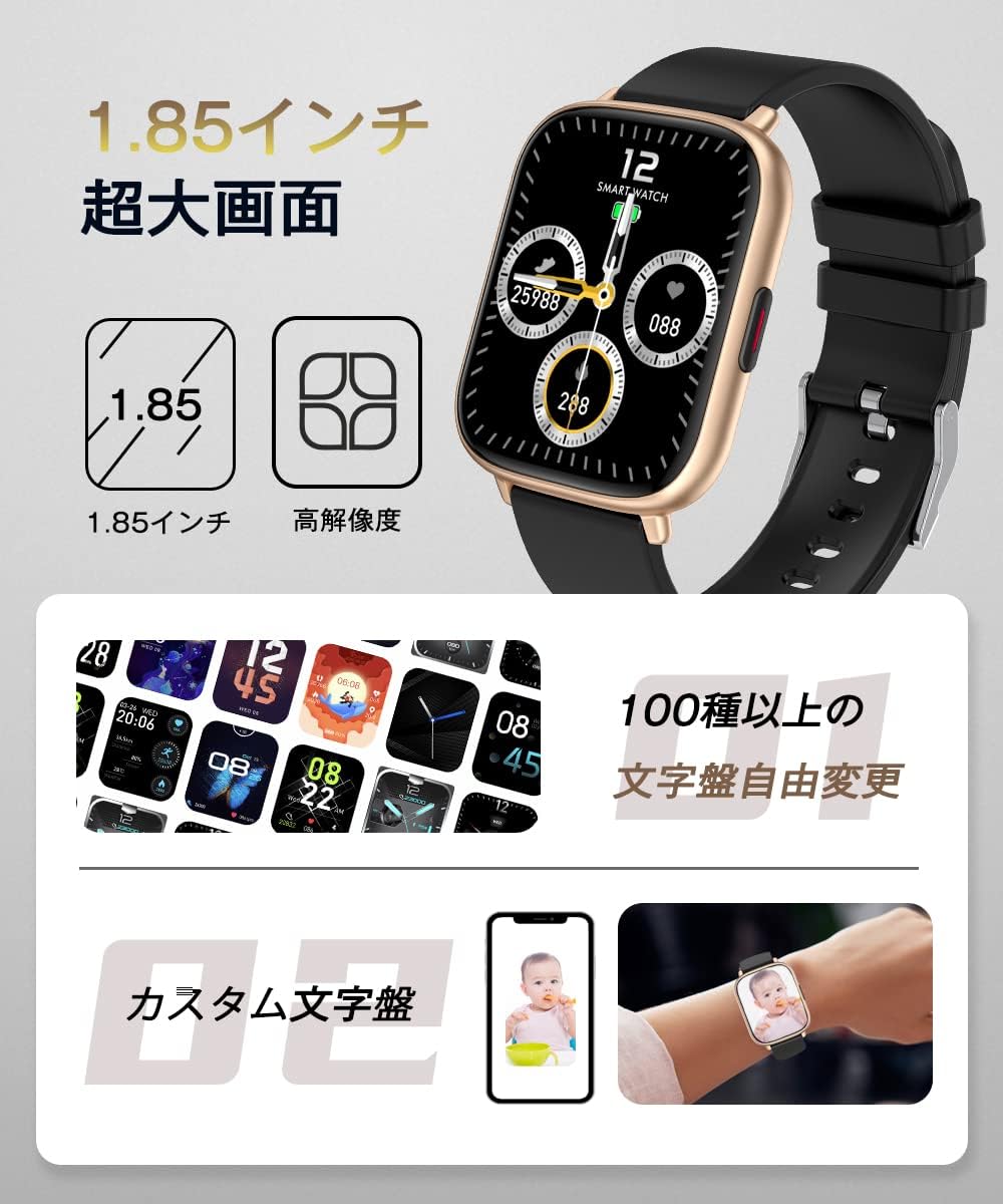 スマートウォッチ 2022革新モデル 【1.85インチ大画面 & 測定機能 & 2色ベルト付き】 Bluetooth5.0 多機能 スポーツウォッチ 活動量計 24種類運動モード smart watch電話&メッセージ通知 IP68防水 天気予報 マナーモード メンズ レディース iPhone/Android対応 日本語説明書付き (ゴールド)