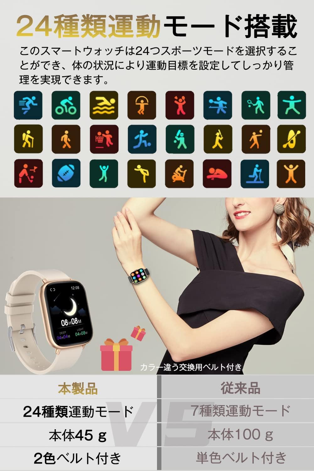 • 【24つスポーツモード& 2色ベルト付き】このスマート腕時計は24つスポーツモードを選択することができ、体の状況により運動目標を設定してしっかり管理を実現できます。さらに、2色のベルトが付属されており、好み・利用シーンにあわせて付け替えが可能です。