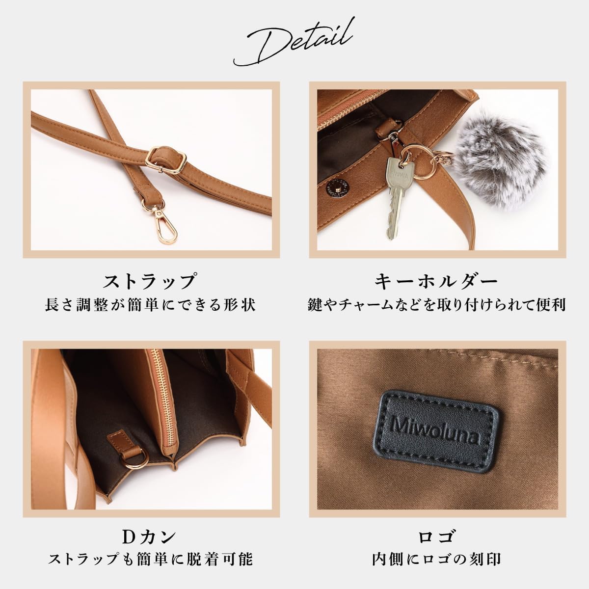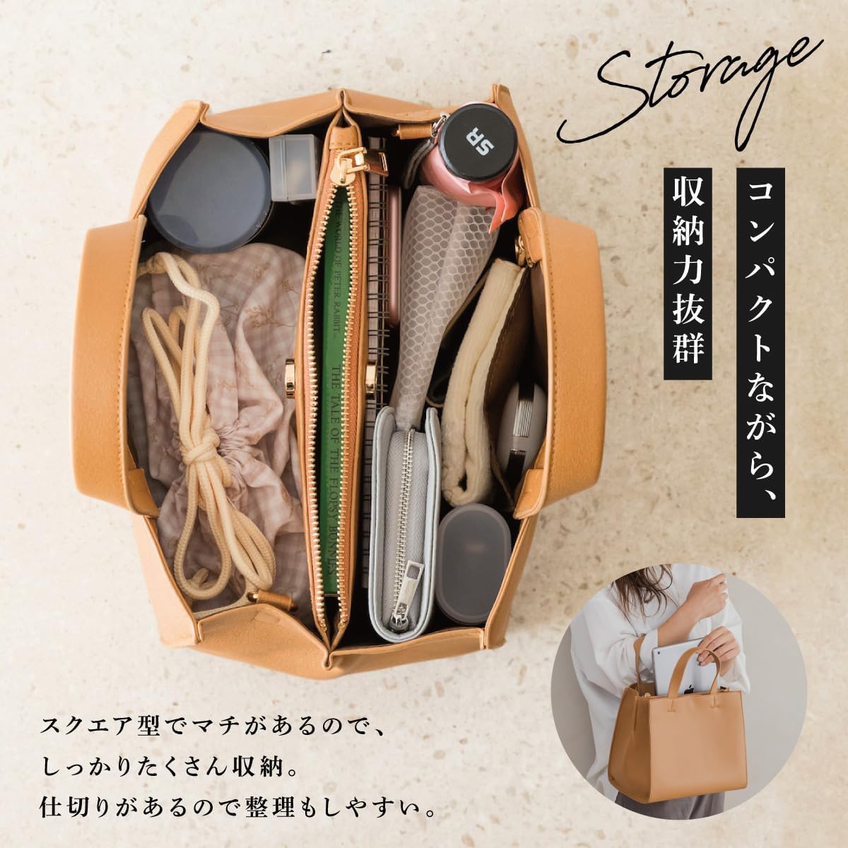 コンパクトなサイズながら、スクエア型なので広々とした大容量。 必要なものをしっかりと収納できるので外出先でも安心です。 内側には様々なサイズのポケットが配置されており小物の整理に便利。 ブランドバッグに負けないカバンです。
